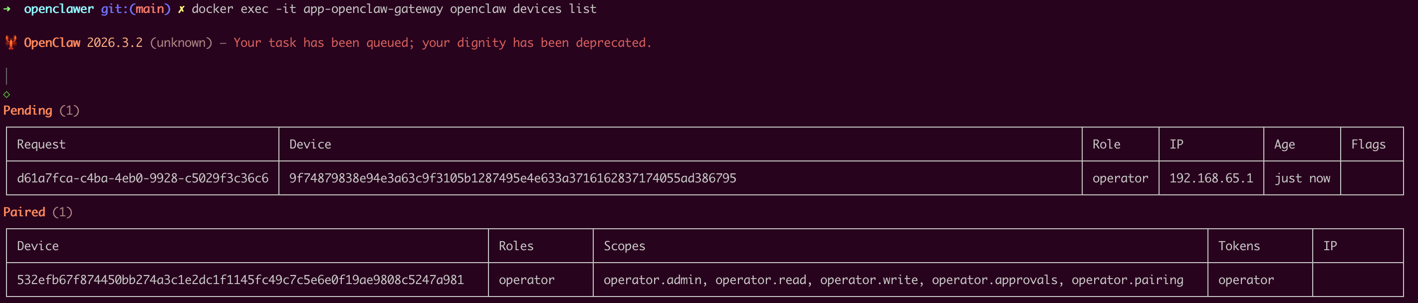 docker exec -it app-openclaw-gateway openclaw devices list