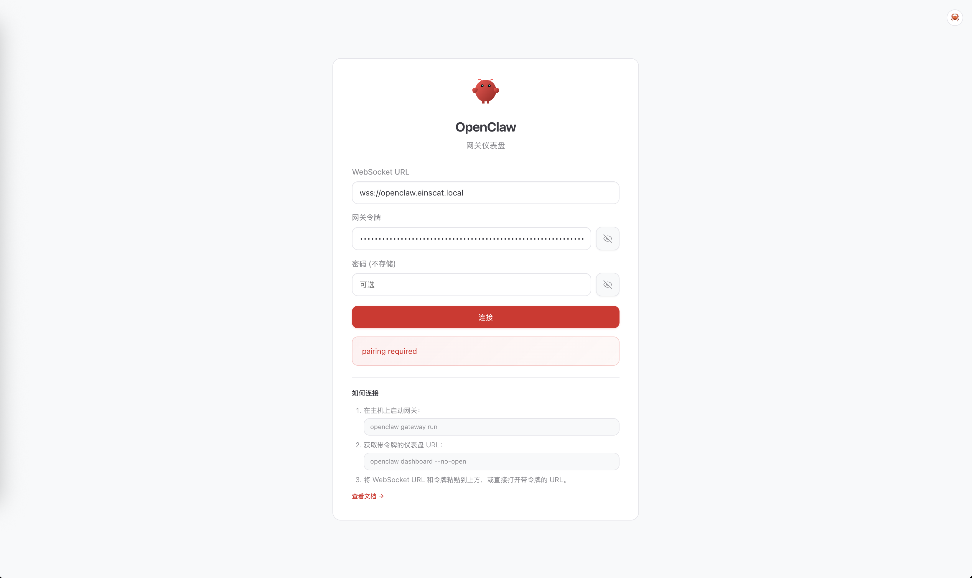 通过可视化页面输入token即可,非常方便,我是容器化部署,输入token后点击【连接】按钮页面会出现 pairing required 提示。