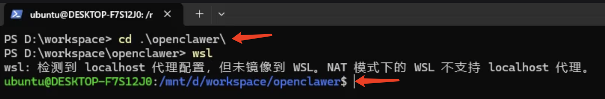 Windows的盘符通常挂载在 /mnt目录下。如果当前所在的目录为 openclawer,在当前目录中打开的终端中输入 wsl,就直接进入到Ubuntu系统中所在的 openclawer 目录: