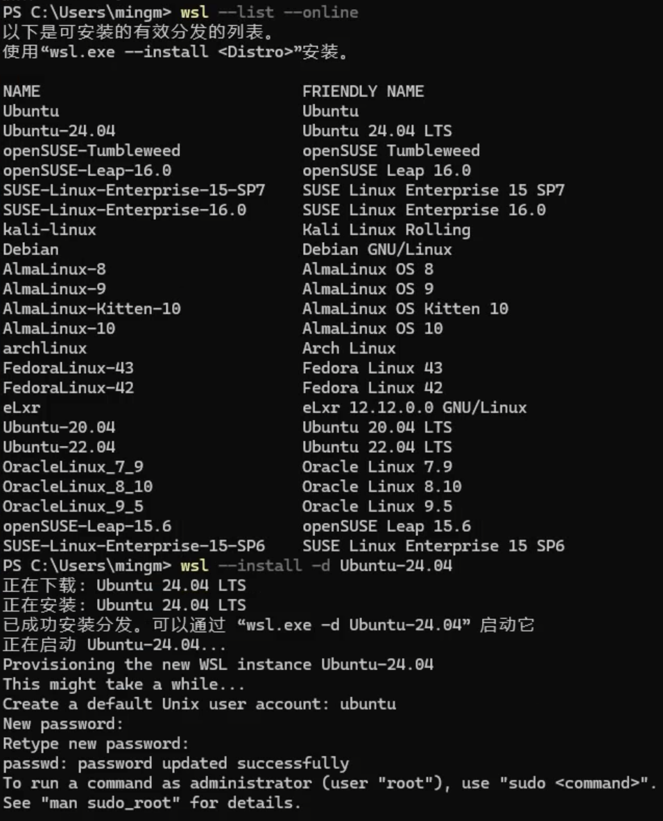 或去 Microsoft Store 搜 Ubuntu 安装。wsl --install -d Ubuntu-24.04