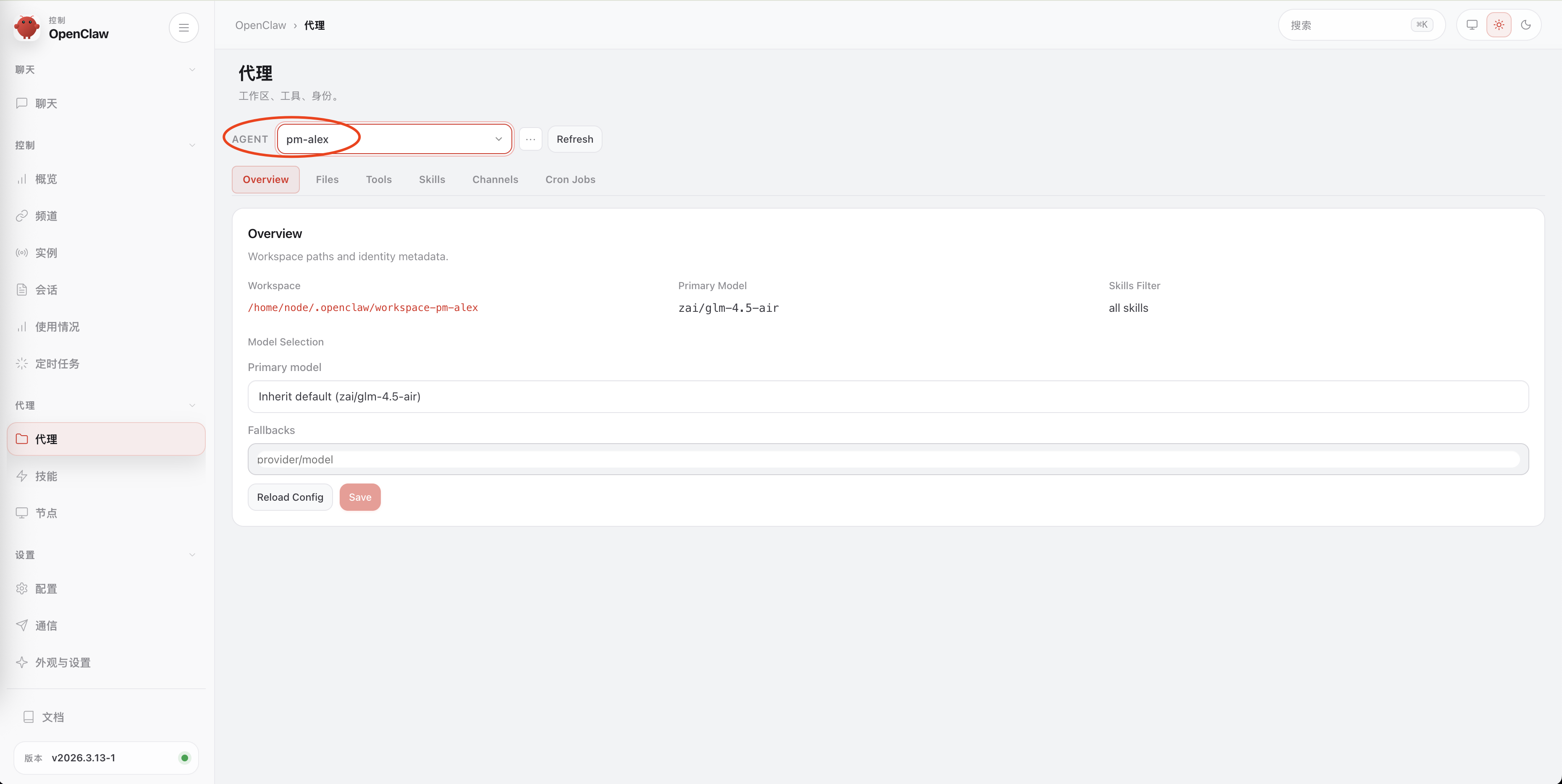 - 修改添加的agent,手动指定模型,同时更新默认Main Agent的workspace