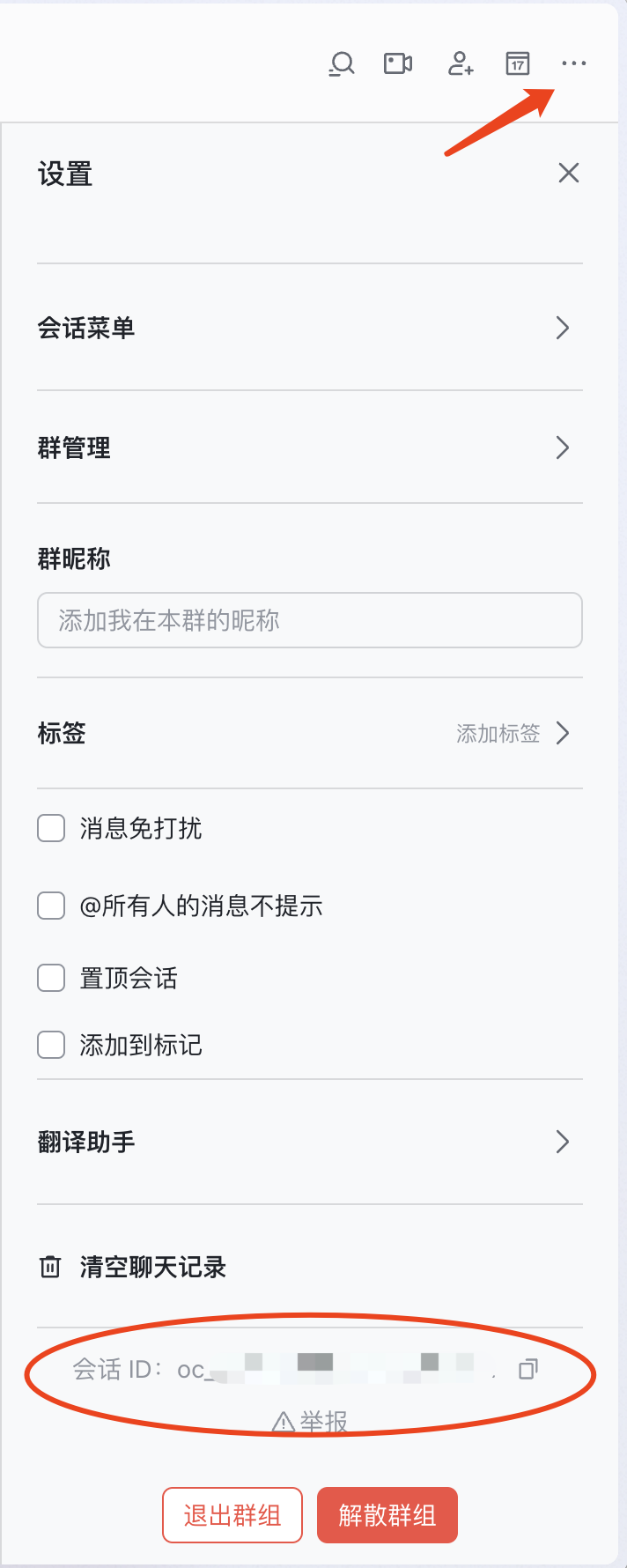也可以点击右上角,选择【设置】,在底部查看群ID:
