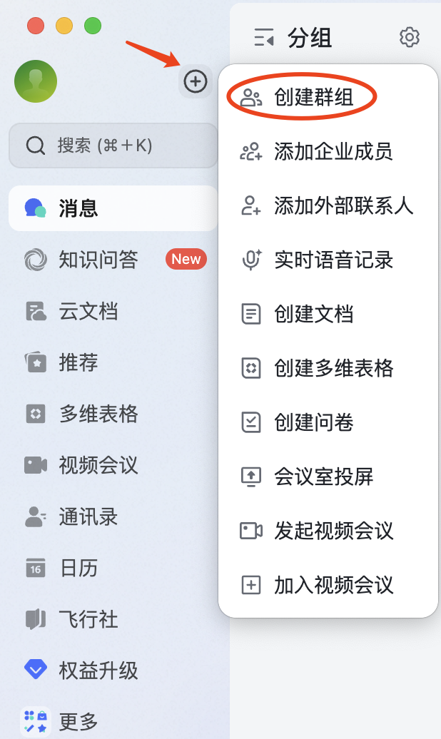 ➜ 1. 点击飞书客户端左上角的【+】加号按钮,点击“创建群组”,输入群名称和其他信息后点击【创建】。