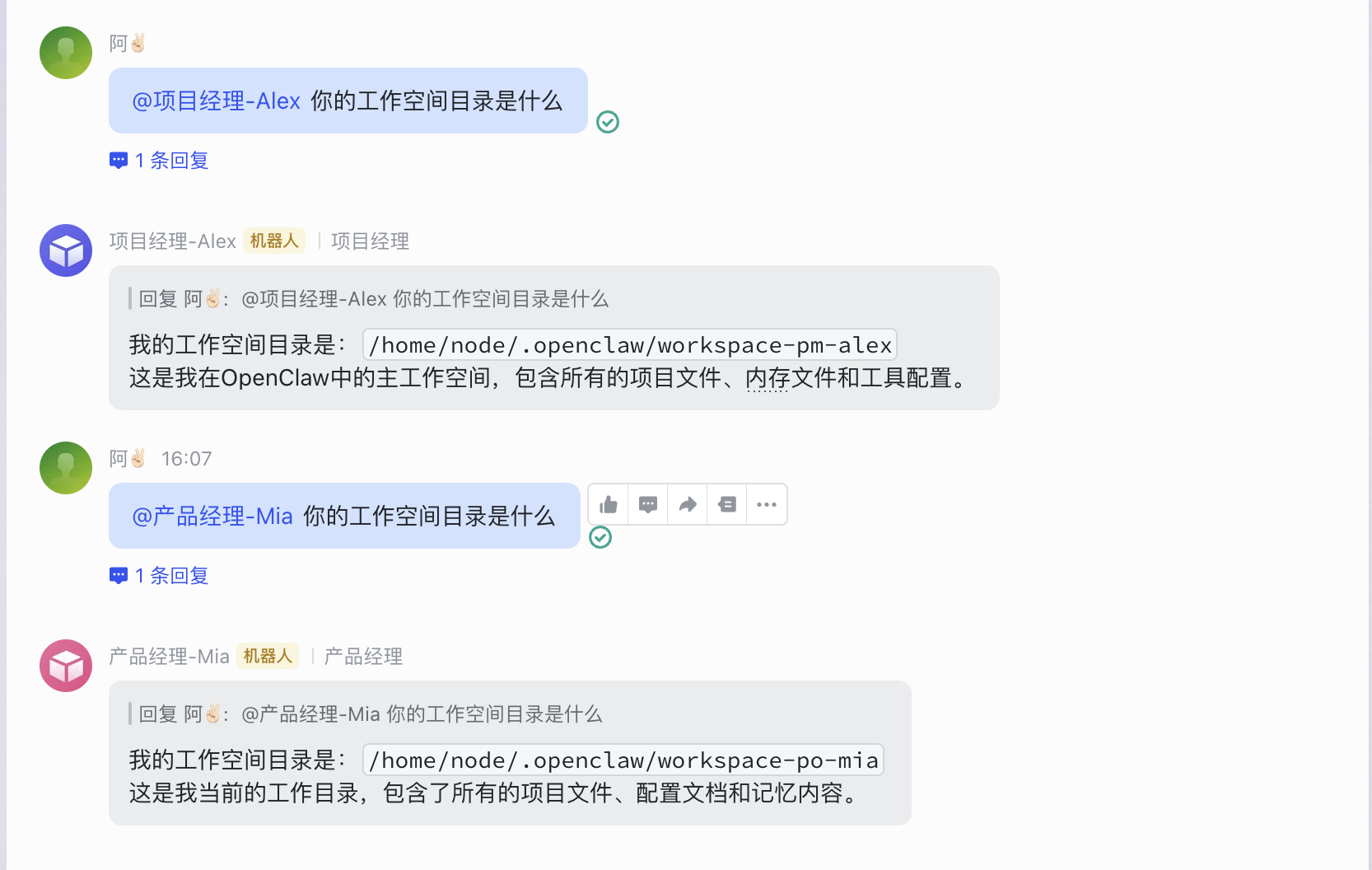 你所在的工作空间路径是什么? - 验证机器人是否返回了新 Agent 的 workspace 路径: